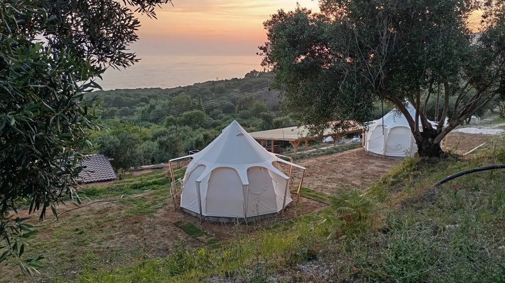 Καθε σκηνή είναι ατομική (αλλά άνετα μένουν και 2 φίλοι) διαθέτει τον δικό της χώρο χαλάρωσης με εκπληκτική θέα στο Ιόνιο.